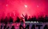 Suporter tim Persis Solo menyalakan flare saat pertandingan melawan Persita Tangerang pada lanjutan BRI Super League 2025-2026 di Stadion Manahan, Solo, Jawa Tengah, Ahad (4/1/2026). Tuan rumah Persis Solo dikalahkan Persita Tangerang dengan skor 1-3. (FOTO : ANTARA FOTO/Mohammad Ayudha)