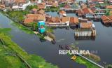 Foto udara suasana tanggul Sungai Bremi yang jebol hingga menyebabkan banjir di Pabean, Kota Pekalongan, Jawa Tengah, Rabu (7/1/2026). Banjir setinggi sekitar 50-80 centimeter itu menggenangi perkampungan daerah Pabean yang menyebabkan aktifitas perekonomian dan pendidikan terganggu dengan sebanyak 300 KK terdampak banjir akibat tanggul Sungai Bremi jebol. (FOTO : ANTARA FOTO/Harviyan Perdana Putra)