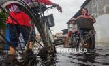 Warga mendorong sepedanya melewati jalan perkampungan yang tergenang banjir di Pabean, Kota Pekalongan, Jawa Tengah, Rabu (7/1/2026). Banjir setinggi sekitar 50-80 centimeter itu menggenangi perkampungan daerah Pabean yang menyebabkan aktifitas perekonomian dan pendidikan terganggu dengan sebanyak 300 KK terdampak banjir akibat tanggul Sungai Bremi jebol. (FOTO : ANTARA FOTO/Harviyan Perdana Putra)