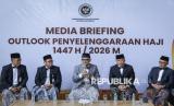 Menteri Haji dan Umrah Mochamad Irfan Yusuf (tengah) didampingi Sekjen Kementerian Haji dan Umrah (Kemenhaj) Teguh Dwi Nugroho (kedua kiri), Irjen Kemenhaj Dendi Suryadi (kedua kanan), Dirjen Bina Penyelenggaraan Haji dan Umrah Kemenhaj Puji Raharjo (kanan), dan Dirjen Pelayanan Haji Kemenhaj Ian Heriyawan (kiri) menyampaikan keterangan saat Media Briefing Outlook Penyelenggaraan Haji 1447H/2026M di Asrama Haji Pondok Gede, Jakarta, Kamis (8/1/2026). Menteri Haji dan Umrah menyatakan tahun ini ada penambahan dua embarkasi di Banten dan Jogja, pelunasan haji reguler mencapai 95,42 persen, proses pemeriksaan istithaah kesehatan lebih diperketat, dan kebutuhan bumbu dapur buat Haji sekitar 600 ton. (FOTO : ANTARA FOTO/Asprilla Dwi Adha)