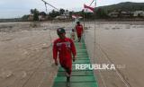 Anggota Vertical Rescue Indonesia melintas di atas jembatan gantung yang baru selesai pembangunannya di Meureudu, Pidie Jaya, Aceh, Jumat (9/1/2026). Jembatan gantung yang dibangun Kementerian Pertahanan, TNI dan Vertical Rescue Indonesia telah menghubungkan kembali desa di Kecamatan Meureudu dan desa di kecamatan Meurah Dua sehingga mempermudah akses transportasi, pendidikan serta perekonomian masyarakat pascabencana banjir bandang. (FOTO : ANTARA FOTO/Irwansyah Putra)