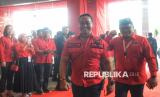 Mantan Panglima TNI Jenderal (Purn) Andika Perkasa didampingi Sekjen PDIP Hasto Kristiyanto saat tiba di area Rapat Kerja Nasional (Rakernas) PDI Perjuangan di Beach City International Stadium (BCIS), Ancol, Jakarta, Sabtu (10/1/2026). Rakernas I PDI Perjuangan Tahun 2026 ini bertepatan dengan peringatan HUT ke-53 PDI Perjuangan dan berlangsung selama tiga hari, mulai 10 hingga 12 Januari 2026. Agenda utama Rakernas membahas langkah strategis partai sebagai penyeimbang pemerintahan serta penguatan konsolidasi organisasi menyongsong agenda politik ke depan. (FOTO : Republika/Prayogi)