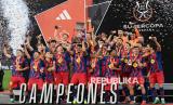 Para pemain Barcelona merayakan kemenangan setelah memenangkan pertandingan final Piala Super Spanyol antara Barcelona dan Real Madrid di Jeddah, Arab Saudi, Ahad (11/1/2026). (FOTO : EPA)