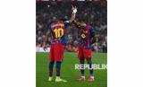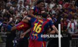Para pemain Barcelona melakukan selebrasi seusai mencetak gol dalam pertandingan final Piala Super Spanyol antara FC Barcelona dan Real Madrid di Jeddah, Arab Saudi, Ahad (11/1/2026). Barcelona sukses menjadi juara Piala Super Spanyol setelah mengalahkan Madrid dengan skor 3-2. (FOTO : EPA)