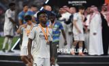 Pemain Real Madrid Vinicius Jr berjalan menjauh dari podium setelah pertandingan final Piala Super Spanyol antara Barcelona dan Real Madrid di Jeddah, Arab Saudi, Ahad (11/1/2026). Real Madrid gagal menjuarai Piala Super Spanyol setelah kalah dari Barcelona dengan skor 2-3. (FOTO : EPA)