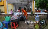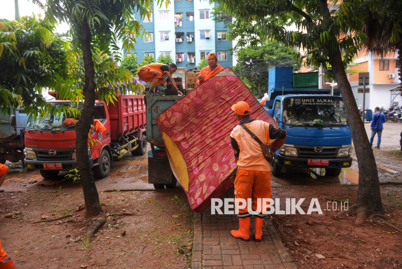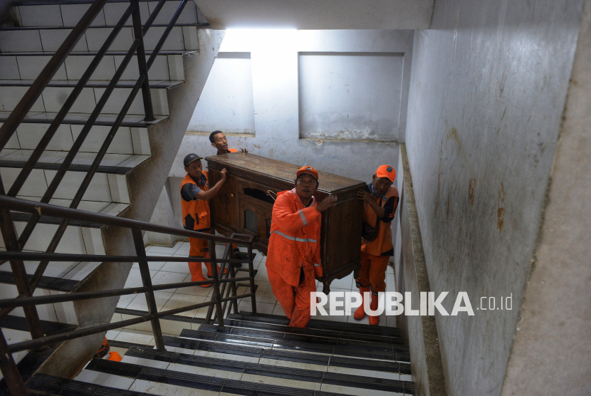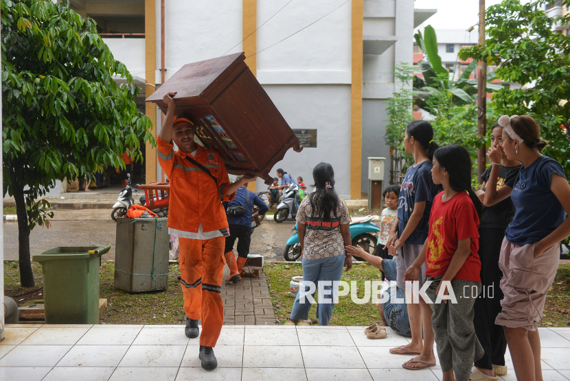 Petugas Penanganan Prasarana dan Sarana Umum (PPSU) mengangkat barang milik warga yang direlokasi dari kawasan Tempat Pemakaman Umum (TPU) Kebon Nanas ke Rumah Susun Sederhana Sewa (Rusunawa) Pulogebang, Jakarta. Relokasi warga TPU Kebon Nanas ke rusunawa dilakukan secara bertahap sejak 6 Januari dan rampung saat ini 12 Januari 2026. (FOTO : Republika/Prayogi)