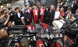 Majelis Hakim tipikor memeriksa barang bukti berupa sepeda motor Harley Davidson untuk Terdakwa kasus dugaan suap terhadap putusan lepas perkara korupsi pemberian fasilitas ekspor minyak sawit mentah (CPO) Ariyanto Bakri (ketiga kanan) dan Marcella Santoso (keenam kanan) di Pengadilan Tipikor, Jakarta, Rabu (14/1/2026). Jaksa Penuntut Umum (JPU) menghadirkan barang berupa mobil Ferrari, dua sepeda motor Harley Davidson dan satu sepeda road bike untuk perkara korupsi korporasi penerima fasilitas ekspor crude palm oil (CPO) sekaligus kasus tindak pidana pencucian uang (TPPU). (FOTO : ANTARA FOTO/Muhammad Adimaja)