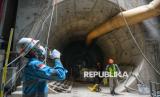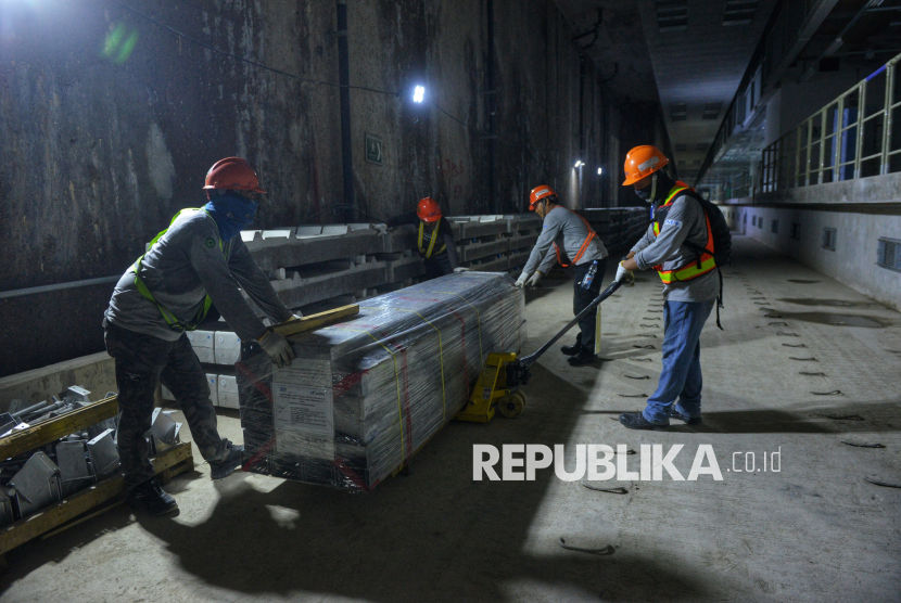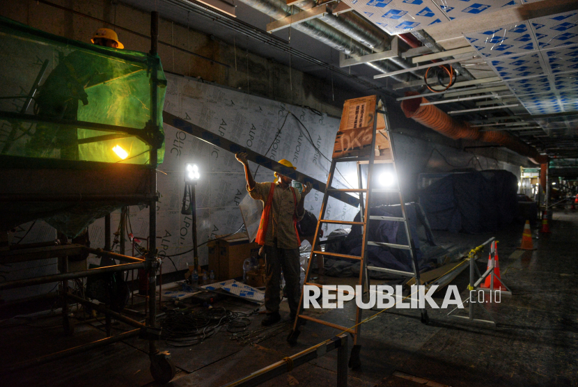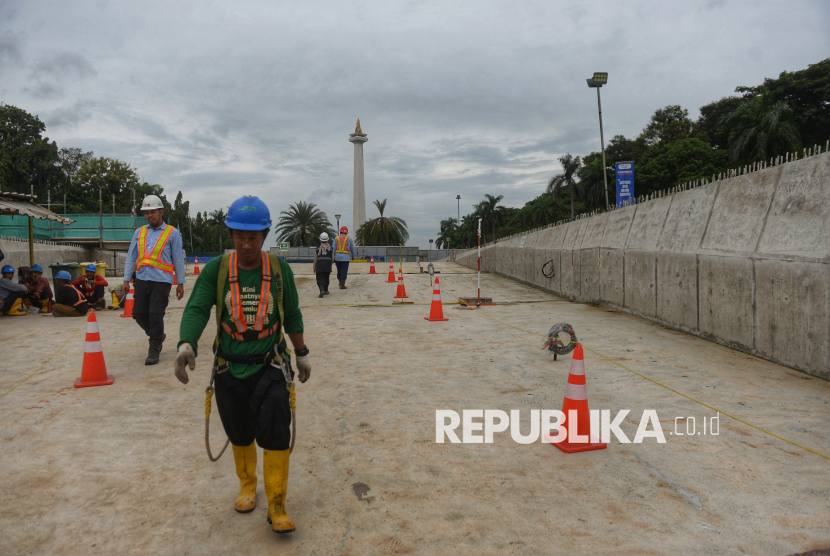 Pekerja beraktivitas di Proyek pembangunan MRT Jakarta Fase 2A CP201, Stasiun Monas, Jakarta, Kamis (15/1/2026). Berdasarkan data dari MRT Jakarta per Desember 2025 progres pekerjaan proyek CP201 sudah mencapai 91,96 persen. Selain itu Kemajuan pembangunan konstruksi fase 2A per Desember 2025 telah melampaui target akhir tahun 2025. Pada akhir Desember lalu, perkembangannya telah mencapai 55,89 persen. Capaian tersebut telah melampaui target akhir 2025 yang ditetapkan, yaitu 53,29 persen. (FOTO : Republika/Prayogi)
