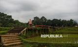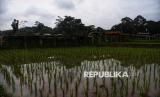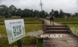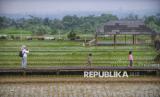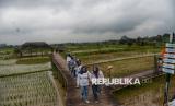 Pengunjung berjalan di tengah hamparan sawah saat berwisata di Kampung Wisata Agro Eduwisata Organik Mulyaharja, Bogor, Jawa Barat, Sabtu (17/1/2026). Kawasan persawahan seluas sekitar 23 hektare ini menawarkan pengalaman wisata edukatif berbasis pertanian organik yang memadukan keindahan alam, praktik pertanian ramah lingkungan, serta berbagai kegiatan edukatif bagi semua kalangan, mulai dari anak-anak hingga orang dewasa. Keindahan lanskap alam dan aktivitas edukasi pertanian menjadi daya tarik tersendiri bagi wisatawan untuk mengisi libur akhir pekan. (FOTO : Republika/Prayogi)