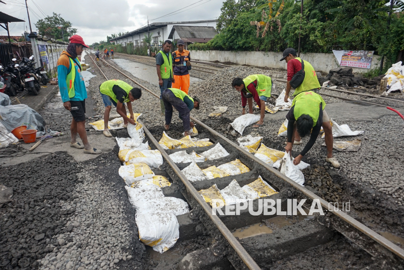 Pekerja melakukan pemadatan jalan sekitar rel pascatergenang banjir di sekitar Stasiun Pekalongan, Kota Pekalongan, Jawa Tengah, Senin (19/1/2026). PT KAI Daop IV Semarang menyatakan jalur rel Stasiun Pekalongan-Sragi yang terendam banjir sejak Jumat (16/1) akibat hujan deras itu sudah bisa dilewati kereta api dengan kecepatan terbatas yang diizinkan setelah dilakukan upaya normalisasi perbaikan jalur dengan mendatangkan kereta perawatan jalur rel, memadatkan pondasi jalur rel dan pengecekan secara manual secara berkala oleh petugas. (FOTO : ANTARA FOTO/Harviyan Perdana Putra)
