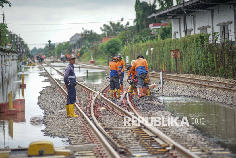 Pekerja mengecek kondisi rel pascatergenang banjir di sekitar Stasiun Pekalongan, Kota Pekalongan, Jawa Tengah, Senin (19/1/2026). PT KAI Daop IV Semarang menyatakan jalur rel Stasiun Pekalongan-Sragi yang terendam banjir sejak Jumat (16/1) akibat hujan deras itu sudah bisa dilewati kereta api dengan kecepatan terbatas yang diizinkan setelah dilakukan upaya normalisasi perbaikan jalur dengan mendatangkan kereta perawatan jalur rel, memadatkan pondasi jalur rel dan pengecekan secara manual secara berkala oleh petugas. (FOTO : ANTARA FOTO/Harviyan Perdana Putra)