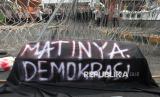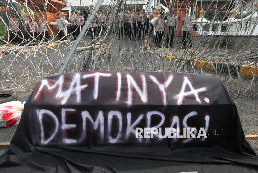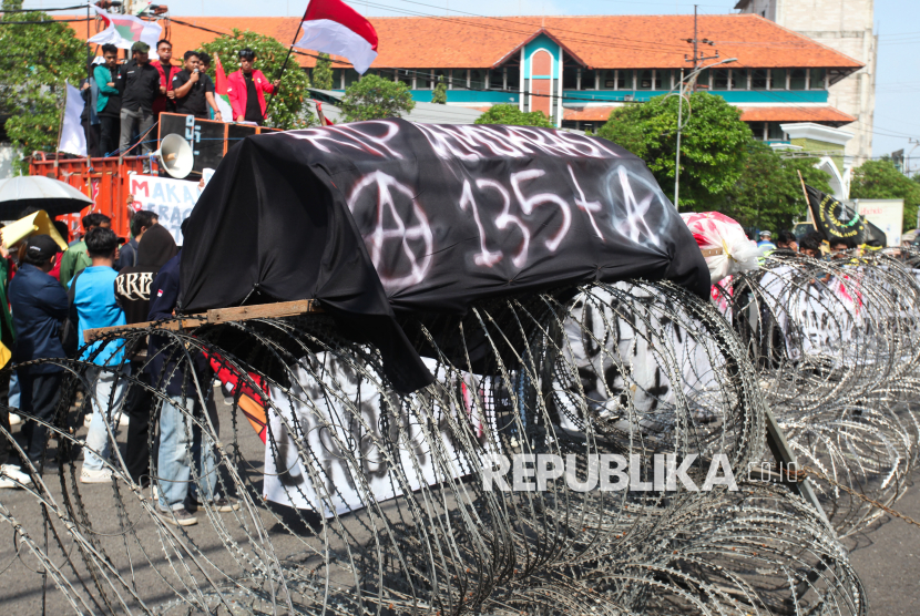 REPUBLIKA.CO.ID, SURABAYA -- Mahasiswa dari aliansi BEM Nusantara Jawa Timur berunjuk rasa di depan gedung DPRD Provinsi Jawa Timur Jalan Indrapura, Surabaya, Jawa Timur, Senin (19/1/2026).