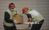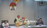 Petugas KPK bersiap menunjukan barang bukti saat konferensi pers terkait Operasi Tangkap Tangan (OTT) yang melibatkan Bupati Pati Sudewo di Gedung Merah Putih KPK, Jakarta, Selasa (21/1/2026). Bupati Pati Sudewo resmi ditahan KPK terkait dugaan kasus pemerasan dalam pengisian jabatan perangkat desa di lingkungan Pemerintahan Kabupaten Pati. (FOTO : Republika/Prayogi)