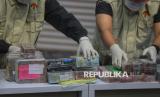 Petugas KPK menunjukan barang bukti saat konferensi pers terkait Operasi Tangkap Tangan (OTT) yang melibatkan Bupati Pati Sudewo di Gedung Merah Putih KPK, Jakarta, Selasa (21/1/2026). Tim KPK mengamankan sejumlah barang bukti berupa uang tunai senilai Rp2,6 miliar. (FOTO : Republika/Prayogi)