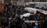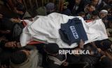 REPUBLIKA.CO.ID, GAZA -- Warga membawa jenazah tiga jurnalis yang syahid akibat serangan udara Israel di Rumah Sakit Nasser, Khan Yunis, Gaza Selatan, Rabu (21/1/2026).