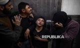 Keluarga menangisi jenazah Moatasem (13), remaja Gaza yang syahid akibat serangan udara Israel di Rumah Sakit Nasser, Khan Yunis, Jalur Gaza selatan, Rabu (21/1/2026). Menurut petugas medis di rumah sakit tersebut, remaja Palestina itu tewas akibat tembakan Israel saat mencari kayu bakar di sebelah timur kota. Setidaknya 11 orang syahid dan enam lainnya terluka dalam serangkaian serangan Israel di seluruh wilayah tersebut pada Rabu (21/1). (FOTO : EPA/HAITHAM IMAD)