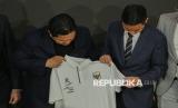Ketua Umum PSSI Erick Thohir (kiri) menerima cinderamata berupa kaus produk apparel Kelme dari President of Kelme, Clinton Ke (kanan) saat Peluncuran Kerjasama PSSI dan Official Partner Timnas Indonesia di Jakarta, Jumat (23/1/2026). PSSI resmi bekerjasama dengan produsen apparel asal Spanyol, Kelme untuk penyedia jersi timnas sepak bola dan timnas futsal Indonesia yang berlangsung sampai 2030. Sementara, untuk peluncuran jersi resmi timnas Indonesia akan digelar pada bulan Maret 2026 mendatang. (FOTO : Republika/Thoudy Badai)
