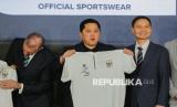 Ketua Umum PSSI Erick Thohir (tengah) menerima cinderamata berupa kaus produk apparel Kelme dari President of Kelme, Clinton Ke (kanan) saat Peluncuran Kerjasama PSSI dan Official Partner Timnas Indonesia di Jakarta, Jumat (23/1/2026). PSSI resmi bekerjasama dengan produsen apparel asal Spanyol, Kelme untuk penyedia jersi timnas sepak bola dan timnas futsal Indonesia yang berlangsung sampai 2030. Sementara, untuk peluncuran jersi resmi timnas Indonesia akan digelar pada bulan Maret 2026 mendatang. (FOTO : Republika/Thoudy Badai)