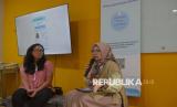 Jurnalis Republika Lida bersama Praktisi Sustainable Living Nada Arini saat talkshow dalam acara Temu Perempuan Minimalis di Sekolah Murid Merdeka, Pesanggrahan, Jakarta, Ahad (25/1/2026). Sesi talkshow dalam acara temu perempuan minimalis ini membahas sekaligus menjadi ruang belajar bersama mengenai upaya mengurangi limbah fesyen, mulai dari bijak membeli, bijak memakai, hingga bijak membuang. Temu Perempuan Minimalis merupakan acara tahunan yang diselenggarakan oleh Minimalist Moms Indonesia, sebuah komunitas perempuan,baik yang sudah menikah maupun belum, yang sedang belajar menerapkan gaya hidup minimalis, dimulai dari rumah dalam keseharian dan pengasuhan. Selain talkshow, acara Temu Perempuan Minimalis juga diisi beragam kegiatan edukatif yang berfokus pada penerapan gaya hidup minimalis, berkesadaran, serta berkelanjutan dalam keseharian. (FOTO : Republika/Prayogi)