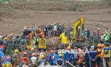 Tim SAR gabungan mengevakuasi jenazah korban bencana tanah longsor yang ditemukan di Desa Pasirlangu, Cisarua, Kabupaten Bandung Barat, Jawa Barat, Ahad (25/1/2026). Berdasarkan hasil asesmen tim SAR gabungan hingga Ahad (25/1) pukul 10.00 WIB, sebanyak 11 orang ditemukan meninggal dunia, dan 79 lainnya masih dalam pencarian. (FOTO : EPA/KHAIRIZAL MARIS)