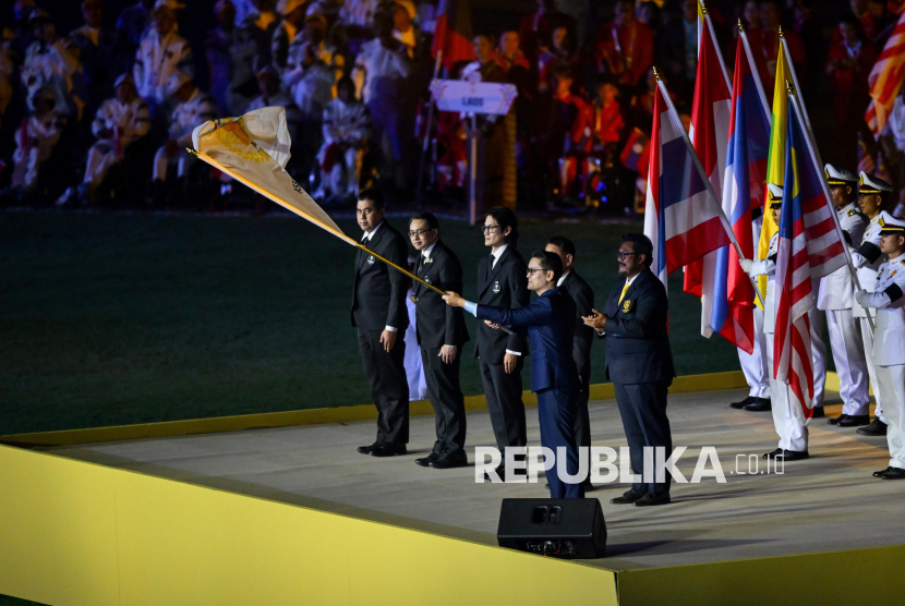 Menteri Pemuda dan Olahraga Malaysia Mohamad Taufiq bin Johari (keempat kiri) memegang bendera Federasi ASEAN Para Games sebagai simbol penyelenggaraan ASEAN Para Games ke 14 di Malaysia saat upacara penutupan ASEAN Para Games 2025 Thailand di 80th Birthday Stadium, Nakhon Ratchasima, Thailand, Senin (26/1/2026). Tim Indonesia berada di peringkat kedua dengan mengumpulkan 135 medali emas, 144 medali perak, dan 114 medali perunggu dalam pesta olahraga terbesar se-Asia Tenggara untuk atlet disabilitas tersebut. (FOTO : ANTARA FOTO/Rivan Awal Lingga)
