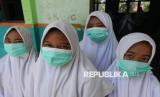 Sejumlah pelajar menggenakan masker yang dibagikan oleh Puskesmas di Madrasah Tsanawiyah Negeri (MTsN) Blang Bale, Kecamatan Samatiga, Aceh Barat, Aceh, Selasa (27/1/2026). Sebanyak 600 masker dibagikan kepada siswa-siswi untuk mengantisipasi penyakit Infeksi Saluran Pernafasan Akut (ISPA) seiring semakin tebalnya kabut asap dampak Kebakaran Hutan dan Lahan (Karhutla) yang terus meluas di Kabupaten setempat. (FOTO : ANTARA FOTO/Syifa Yulinnas)