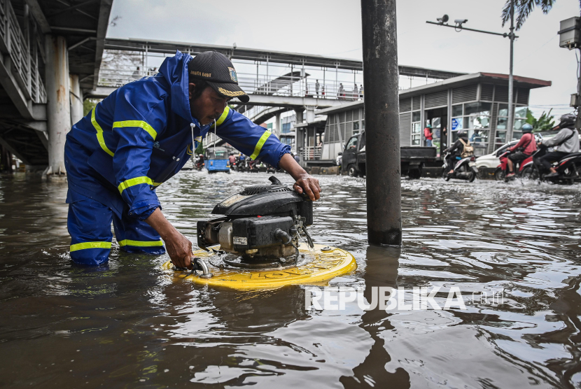 Petugas Dinas Sumber Daya Air DKI Jakarta mengoperasikan mesin pompa apung saat banjir di ruas Jalan Daan Mogot, Jakarta, Kamis (29/1/2026). Banjir setinggi 40-60 cm disebabkan curah hujan tinggi dan buruknya sistem drainase sehingga mengganggu lalu lintas di jalan nasional tersebut. (FOTO : ANTARA FOTO/Sulthony Hasanuddin)