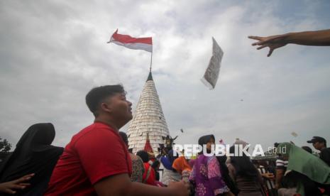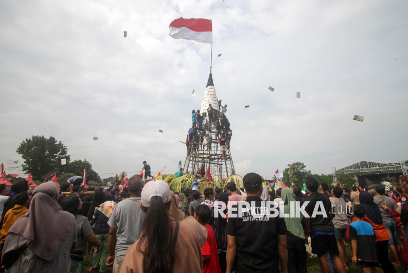 Warga berebut tumpeng tempe saat ruwat desa di Lapangan Desa Sedenganmijen, Krian, Sidoarjo, Jawa Timur, Ahad (1/2/2026). Tradisi ruwat desa dengan membuat tumpeng tempe setinggi 9 meter yang diselenggarakan setiap tahun menjelang bulan suci Ramadhan tersebut menjadi ajang sedekah dan sebagai bentuk rasa syukur para perajin tempe kepada Tuhan YME atas limpahan rezeki serta promosi wisata di daerah itu. (FOTO : ANTARA FOTO/Umarul Faruq)