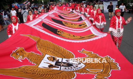 REPUBLIKA.CO.ID, SOLO -- Anggota Komunitas Cinta Kebaya Depok membentangkan kain batik tulis sepanjang 17 meter dengan motif gambar wajah presiden Republik Indonesia saat parade di Jalan Slamet Riyadi Solo, Jawa Tengah, Ahad (1/2/2026).