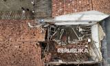 Foto udara kondisi ruang kelas ambruk di Madrasah Ibtidaiyah Miftahul Falah, Gunungputri, Kabupaten Bogor,Jawa Barat, Senin (2/2/2026). Ambruknya atap bangunan sekolah tersebut terjadi pada Ahad (1/2/2026) akibat kondisi bangunan yang sudah lapuk dan tidak terawat, sementara siswa diliburkan dan belajar secara daring. (FOTO : ANTARA FOTO/Yulius Satria Wijaya)