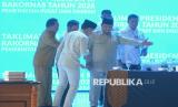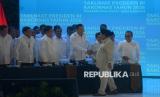 Presiden Prabowo Subianto menyalami jajaran menteri Kabinet Merah Putih usai menyampaikan taklimat dalam Rapat Koordinasi Nasional (Rakornas) Pemerintah Pusat dan Pemerintah Daerah Tahun 2026 di Sentul International Convention Center (SICC), Bogor, Jawa Barat, Senin (2/2/2026). Rakornas tersebut diikuti oleh sekitar 4.487 peserta yang terdiri atas unsur kementerian/lembaga, gubernur, bupati/wali kota, pimpinan DPRD, serta anggota Forum Koordinasi Pimpinan Daerah (Forkopimda) tingkat provinsi dan kabupaten/kota se-Indonesia. Rakornas ini bertujuan memperkuat sinergi antara pemerintah pusat dan daerah dalam mengimplementasikan program prioritas Presiden menuju Indonesia Emas 2045. (FOTO : Republika/Prayogi )