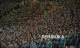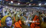 Peserta menerikkan yel-yel dalam Rapat Koordinasi Nasional (Rakornas) Pemerintah Pusat dan Pemerintah Daerah Tahun 2026 di Sentul International Convention Center (SICC), Bogor, Jawa Barat, Senin (2/2/2026). Rakornas tersebut diikuti oleh sekitar 4.487 peserta yang terdiri atas unsur kementerian/lembaga, gubernur, bupati/wali kota, pimpinan DPRD, serta anggota Forum Koordinasi Pimpinan Daerah (Forkopimda) tingkat provinsi dan kabupaten/kota se-Indonesia. Rakornas ini bertujuan memperkuat sinergi antara pemerintah pusat dan daerah dalam mengimplementasikan program prioritas Presiden menuju Indonesia Emas 2045. (FOTO : Republika/Prayogi )