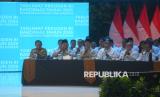 Presiden Prabowo Subianto bersama Wakil Presiden Gibran Rakabuming Raka serta jajaran Kabinet Merah Putih menghadiri dalam Rapat Koordinasi Nasional (Rakornas) Pemerintah Pusat dan Pemerintah Daerah Tahun 2026 di Sentul International Convention Center (SICC), Bogor, Jawa Barat, Senin (2/2/2026). Rakornas tersebut diikuti oleh sekitar 4.487 peserta yang terdiri atas unsur kementerian/lembaga, gubernur, bupati/wali kota, pimpinan DPRD, serta anggota Forum Koordinasi Pimpinan Daerah (Forkopimda) tingkat provinsi dan kabupaten/kota se-Indonesia. Rakornas ini bertujuan memperkuat sinergi antara pemerintah pusat dan daerah dalam mengimplementasikan program prioritas Presiden menuju Indonesia Emas 2045. (FOTO : Republika/Prayogi )