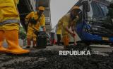 Perbaikan jalan berlubang yang dilakukan saat ini masih bersifat sementara. Perbaikan permanen akan dilakukan setelah intensitas hujan di Jakarta menurun. (FOTO : Republika/Thoudy Badai)