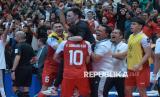 Pelatih Timnas futsal Indonesia Hector Souto melakukan selebrasi bersama tim seusai mengalahkan Jepang pada pertandingan semifinal AFC Futsal Asian Cup 2026 di Indonesia Arena, Senayan, Jakarta, Sabtu (5/2/2026). Timnas Futsal Indonesia melaju ke final Piala Futsal Asia setelah mengalahkan Jepang dengan skor 5-3. (FOTO : Edwin Putranto/Republika)