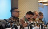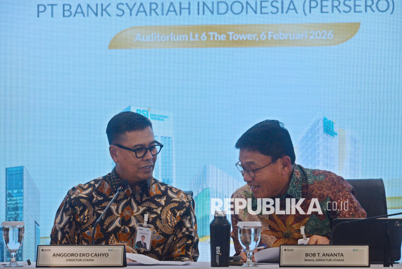 Direktur Utama BSI Anggoro Eko Cahyo bersama Wakil Direktur Utama Bob T. Ananta berbincang saat penyampaian paparan kinerja perseroan untuk tahun buku 2025 di Kantor Pusat BSI, Jakarta, Jumat (6/2/2026). PT Bank Syariah Indonesia (Persero) Tbk mencatatkan kinerja solid sepanjang tahun 2025 dengan rata-rata pertumbuhan jauh di atas industri yang ditopang dari kontribusi perseroan mendorong pembiayaan pro kerakyatan mulai dari segmen konsumer, ASN, BUMN, SME, Mikro dan Komersial yang mendominasi 90 persen pembiayaan BSI, dimana langkah ini juga mendongkrak laba mencapai Rp7,57 triliun atau naik 8,02 persen (YoY). (FOTO : Edwin Putranto/Republika)