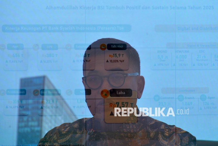 Direktur Utama BSI Anggoro Eko Cahyo menyampaikan paparan kinerja perseroan untuk tahun buku 2025 di Kantor Pusat BSI, Jakarta, Jumat (6/2/2026). PT Bank Syariah Indonesia (Persero) Tbk mencatatkan kinerja solid sepanjang tahun 2025 dengan rata-rata pertumbuhan jauh di atas industri yang ditopang dari kontribusi perseroan mendorong pembiayaan pro kerakyatan mulai dari segmen konsumer, ASN, BUMN, SME, Mikro dan Komersial yang mendominasi 90 persen pembiayaan BSI, dimana langkah ini juga mendongkrak laba mencapai Rp7,57 triliun atau naik 8,02 persen (YoY). (FOTO : Edwin Putranto/Republika)