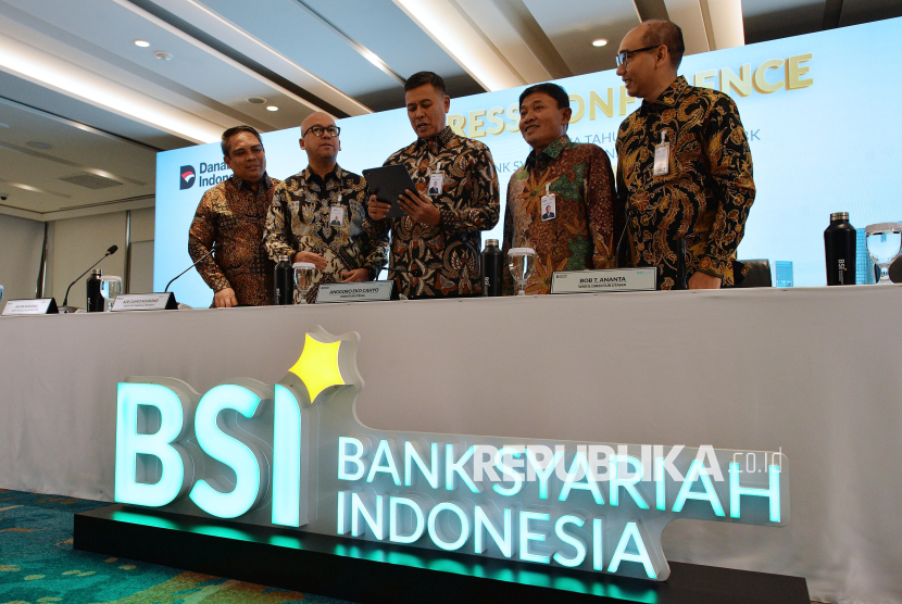 Direktur Utama BSI Anggoro Eko Cahyo (kedua kiri), Wakil Direktur Utama Bob T. Ananta (tengah), Direktur Sales and Distribution Anton Sukarna (kanan), Direktur Finance and Strategy Ade Cahyo Nugroho (kiri), dan Direktur Risk Management Grandhis H. Harumansyah (kedua kanan) berbincang sebelum menyampaikan paparan kinerja perseroan untuk tahun buku 2025 di Kantor Pusat BSI, Jakarta, Jumat (6/2/2026). PT Bank Syariah Indonesia (Persero) Tbk mencatatkan kinerja solid sepanjang tahun 2025 dengan rata-rata pertumbuhan jauh di atas industri yang ditopang dari kontribusi perseroan mendorong pembiayaan pro kerakyatan mulai dari segmen konsumer, ASN, BUMN, SME, Mikro dan Komersial yang mendominasi 90 persen pembiayaan BSI, dimana langkah ini juga mendongkrak laba mencapai Rp7,57 triliun atau naik 8,02 persen (YoY). (FOTO : Edwin Putranto/Republika)