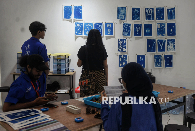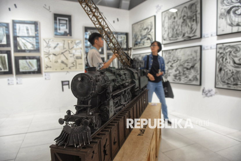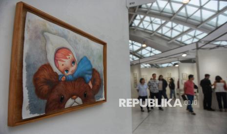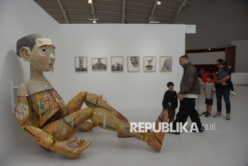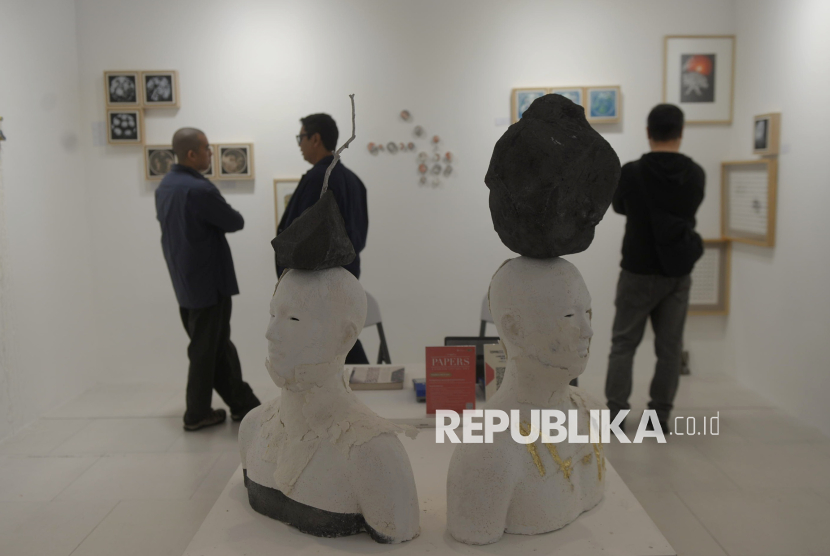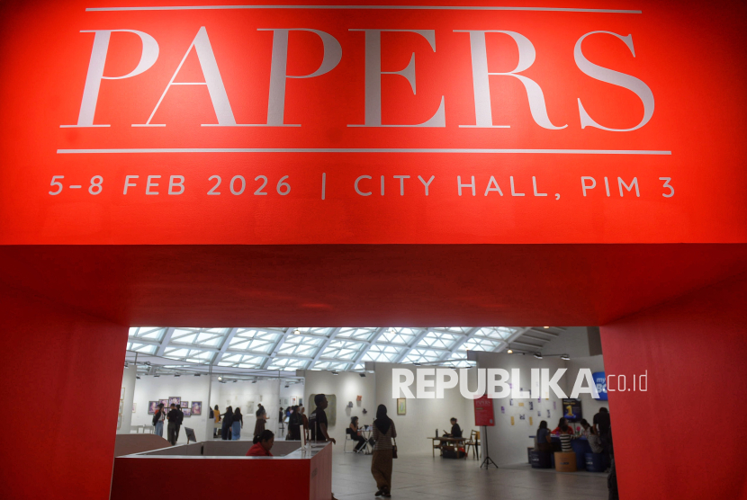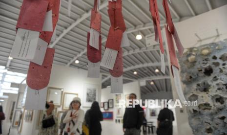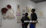 Pengunjung mengamati karya seni dalam Art Jakarta Papers 2026 di City Hall, Pondok Indah Mall 3, Jakarta, Ahad (8/6/2026). Gelaran Art Jakarta Papers 2026 menampilkan beragam eksplorasi ide atau gagasan, ekspresi, kreasi, serta pesan yang disampaikan para perupa melalui medium kertas. Karya yang dipamerkan meliputi sketsa, gambar, cetakan, arsip, patung, hingga instalasi. Art Jakarta Papers hadir dari keinginan untuk memberi perhatian khusus dan dukungan berkelanjutan bagi praktik seni rupa berbahan utama kertas. Sebanyak 28 galeri dari dalam dan luar negeri berpartisipasi dalam helatan perdana Art Jakarta Papers 2026 ini. (FOTO : Republika/Prayogi)