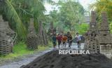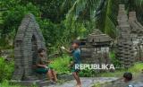 Sejumlah anak-anak bermain di area candi paving di Desa Sembulungan, Cluring, Banyuwangi, Jawa Timur, Ahad (8/2/2026). Sebanyak 13 bangunan menyerupai candi yang terbuat dari bahan paving material proyek pembangunan jalan yang tak kunjung dikerjakan itu dibangun warga menjadi karya seni dan bentuk protes karena menyebabkan penyempitan dan mengganggu pengguna jalan. (FOTO : ANTARA FOTO/Budi Candra Setya)
