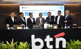 Direktur Utama PT Bank Tabungan Negara (Persero) Tbk (BTN) Nixon LP Napitupulu (tengah) bersama Wakil Direktur Utama BTN Oni Febriarto Rahardjo (ketiga dari kanan), Direktur Network and Retail Funding BTN Rully Setiawan (paling kanan), Direktur Finance and Strategy BTN Nofry Rony Poetra (kedua dari kanan), Direktur Risk Management BTN Setiyo Wibowo (ketiga dari kiri), Direktur Consumer Banking BTN Hirwandi Gafar (kedua dari kiri), serta SEVP Digital Business BTN Thomas Wahyudi (paling kiri) saat konferensi pers Paparan Kinerja BTN Tahun 2025 di Ruang Postpaar, Menara 1 BTN, Jakarta, Senin (9/2/2026). BTN mencatatkan laba bersih konsolidasian sebesar Rp3,5 triliun sepanjang 2025, tumbuh double digit 16,4 persen secara year-on-year (yoy), dengan total aset konsolidasian mencapai Rp527,8 triliun atau meningkat 12,4 persen yoy. (FOTO : Dok Republika)