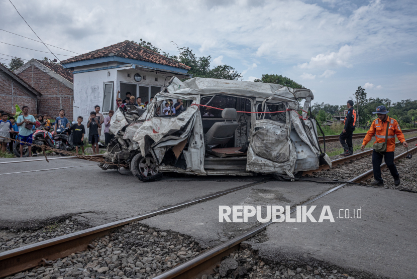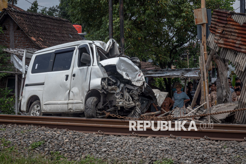 REPUBLIKA.CO.ID, DEMAK -- Kondisi bangkai mobil Daihatsu Grand Max bernomor polisi H 1051 VA yang tertabrak (tertemper) KA Harina relasi Surabaya Pasarturi-Bandung di perlintasan kereta api tanpa palang pintu KM 11+7/8 antara Stasiun Brumbung, Demak - Stasiun Alastua, Semarang, di Desa Brumbung, Kecamatan Mranggen, Kabupaten Demak, Jawa Tengah, Ahad (15/2/2026).
