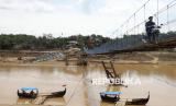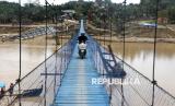 REPUBLIKA.CO.ID, ACEH TAMIANG -- Warga melintasi jembatan gantung darurat di kawasan Lubuk Sidup, Aceh Tamiang, Ahad (15/2/2026). Jembatan sepanjang 120 meter yang membentang di atas Sungai Tamiang itu dibangun oleh Kementerian Pertahanan (Kemenhan), TNI, dan Vertical Rescue Indonesia sebagai upaya memulihkan akses transportasi warga.