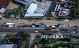 Foto udara kendaraan bermotor melaju perlahan melewati banjir yang menggenangi jalur Pantura Semarang-Demak di Jalan Kaligawe KM 7,5, Semarang, Jawa Tengah, Senin (16/2/2026). Hujan berintensitas tinggi pada Ahad (15/2) malam hingga Senin (16/2) pagi di wilayah hulu hingga hilir Kota Semarang menyebabkan Sungai Babon meluap dan menggenangi jalur Pantura ruas Kabupaten Demak ke arah Kota Semarang, dan mengakibatkan ketersendatan arus lalu lintas yang sempat mencapai sekitar 5 kilometer. (FOTO : ANTARA FOTO/Aji Styawan)