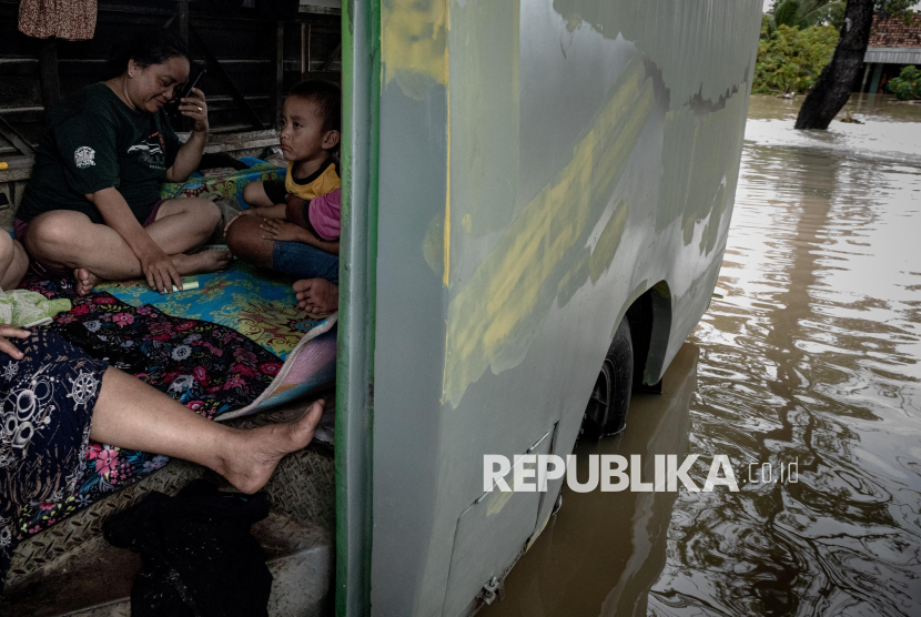 Warga mengungsi di dalam sebuah bus di salah satu bengkel yang tergenang banjir Desa Pilangwetan, Kecamatan Kebonagung,Kabupaten Demak, Jawa Tengah, Selasa (17/2/2026). Menurut data sementara yang dihimpun Pusdalops BPBD Grobogan dan Demak hingga pukul 07:00 WIB, selain memutus akses jalur utama jalan Semarang-Purwodadi, banjir akibat dua titik tanggul Sungai Tuntang yang jebol itu berdampak pada total sekitar 3.924 jiwa di sejumlah desa wilayah Kabupaten Demak dan Grobogan. (FOTO : ANTARA FOTO/Aji Styawan)