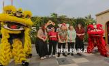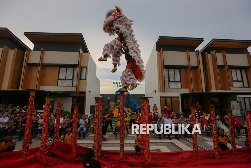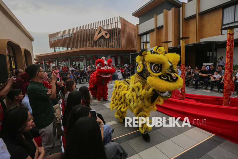 Penampil barongsai menghibur pengunjung saat peluncuran The Skyfront di area Commercial Asthara Skyfront City, Tangerang, Banten, Rabu (25/2/2026). The Skyfront yang merupakan area komersial pertama Asthara Skyfront City secara resmi dibuka dengan pengembangan awal pembangunan area hunian dan infrastruktur seluas 1.100 hektar yang berada di sebelah Bandara International Soekarno-Hatta. Selain itu. Asthara Skyfront City juga menghadirkan destinasi kuliner unggulan dengan nuansa modern di ruang terbuka. (FOTO : Republika/Thoudy Badai)
