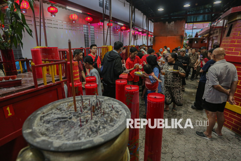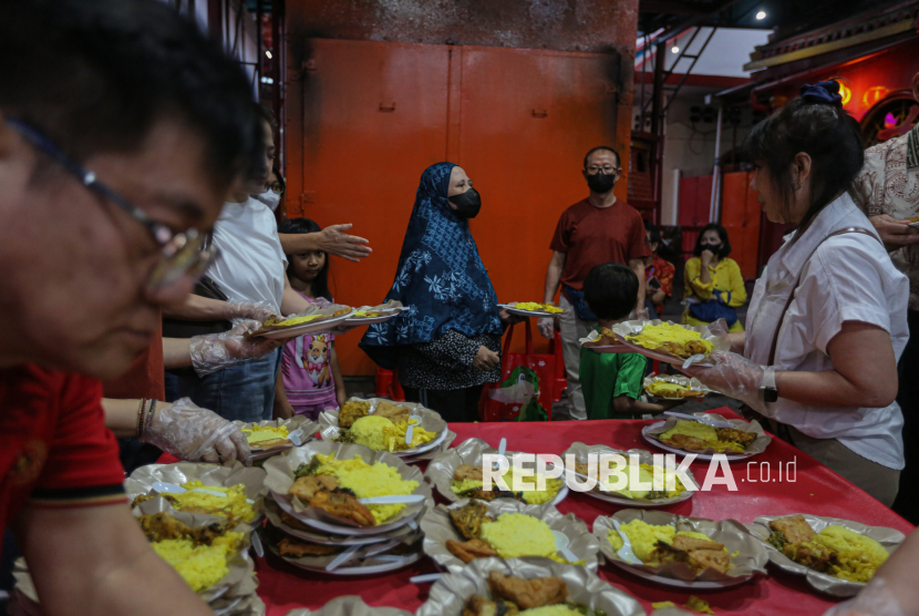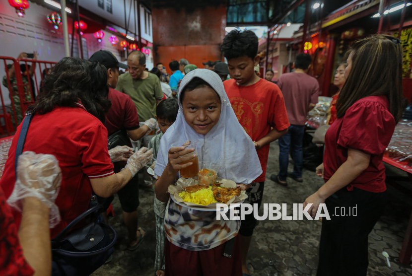 Warga mengambil makanan untuk berbuka puasa di Wihara Dharma Bakti, Jakarta, Senin (23/2/2026). Pada bulan suci Ramadhan, Wihara Dharma Bakti rutin membagikan ratusan porsi makanan untuk berbuka puasa bagi umat muslim dan warga sekitar sebagai bentuk toleransi antarumat beragama. (FOTO : Republika/Thoudy Badai)