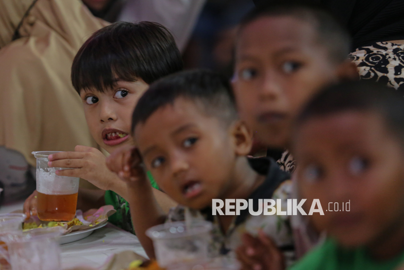 Anak menyantap makanan saat berbuka puasa di Wihara Dharma Bakti, Jakarta, Senin (23/2/2026). Pada bulan suci Ramadhan, Wihara Dharma Bakti rutin membagikan ratusan porsi makanan untuk berbuka puasa bagi umat muslim dan warga sekitar sebagai bentuk toleransi antarumat beragama. (FOTO : Republika/Thoudy Badai)