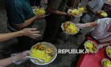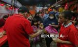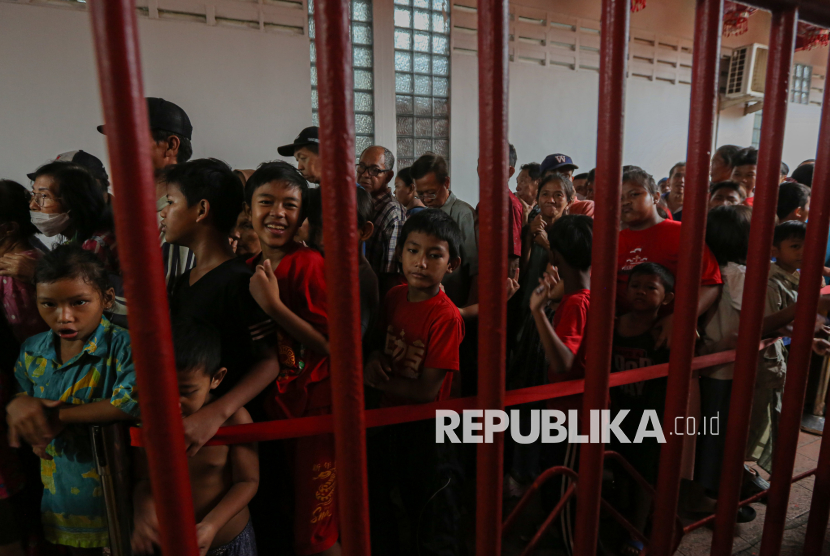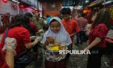Warga mengantre untuk mengambil makanan berbuka puasa di Wihara Dharma Bakti, Jakarta, Senin (23/2/2026). Pada bulan suci Ramadhan, Wihara Dharma Bakti rutin membagikan ratusan porsi makanan untuk berbuka puasa bagi umat muslim dan warga sekitar sebagai bentuk toleransi antarumat beragama. (FOTO : Republika/Thoudy Badai)