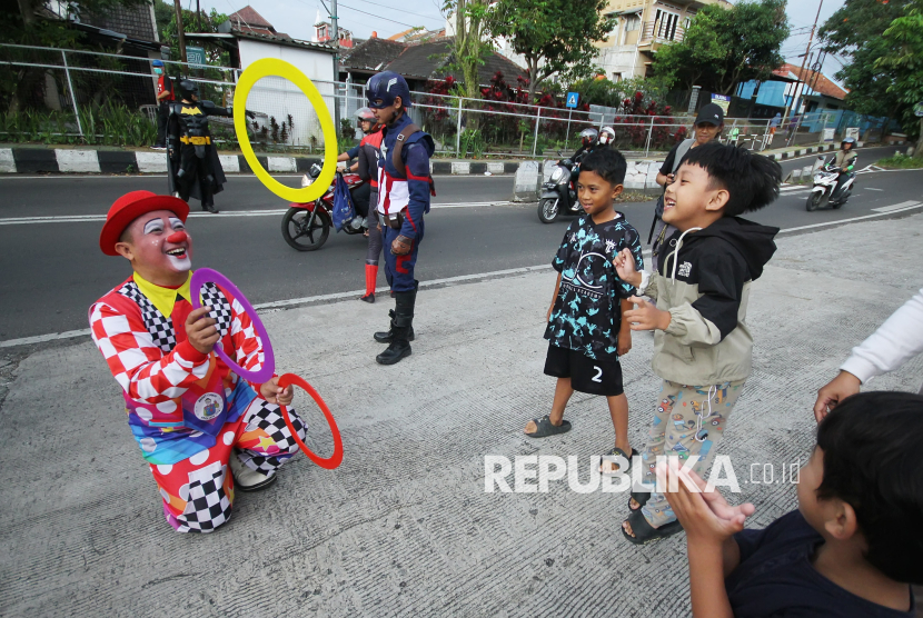 Badut bersama para cosplayer super hero dari komunitas Badut Cimahi menghibur masyarakat saat kegiatan bagi-bagi takjil di jalan Aruman, Cimahi Utara, Kota Cimahi, Selasa (3/3/2026). Kegiatan berbagi takjil ini sebagai bentuk empati untuk masyarakat yang sedang berpuasa Ramadhan sekaligus kampanye perdamaian, agar selalu jaga emosi karena perdamaian itu indah. (FOTO : Edi Yusuf)